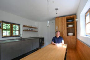 Ideen sind das eine. Doch wie kann man seine Kunden auf die gestalterische Entdeckungsreise mitnehmen? „Hierbei hilft uns enorm die moderne Technik“, er- läutert Huber. Er erstellt von Anfang an 3D-Simulationen seiner Entwürfe. So könnten sich die Kunden die Gestaltung des Raums wesentlich besser vorstellen als nur anhand einer zweidimensionalen Zeichnung. „Wir gehen dabei schon zu Beginn in die Details“, führt der Schreiner weiter aus. So sind beispielsweise in einem Küchenentwurf die Laufwege mit eingezeichnet, auf denen die Bewohner die Einkäufe hereinbringen. Apropos Küche: Sie ist für Huber der wichtigste Raum des Hauses schlechthin. „Die Futterkrippe: Da gehört eine Küche dazu und ein Tisch, an dem die Familie sich trifft. Bei den Räumen gibt die Häufigkeit des Gebrauchs die Richtung vor.“ Bei den verwendeten Materialien setzt er nicht aus- schließlich auf Holz, auch Metall ist für ihn ein wichtiges Element. Bei der Auswahl der Rohstoffe achtet er nur auf eines: Echtheit. Kunststoffoberflächen in Holzoptik lehnt er grundsätzlich ab. Vor Ort bei den Bauherren schaut sich Huber zuerst die Ausrichtung der Räume an. Er versucht dann, die Stärken eines Raums zu erkennen: „Was sehe ich, wenn ich aus dem Fenster schaue? Wenn in einer Richtung etwa die Berge am Horizont auftauchen, richte ich die Küchenzeile so aus, dass ich beim Arbeiten die Berge sehe.“ Oder wenn sich praktische Fragen auftun, die große Wirkungen auf die Küche haben. Es komme vor, dass der Wasseranschluss falsch gesetzt wurde. Dann überzeugt Huber die Kunden, diesen im Sinne des besten Ergebnisses nochmals zu verlegen.
