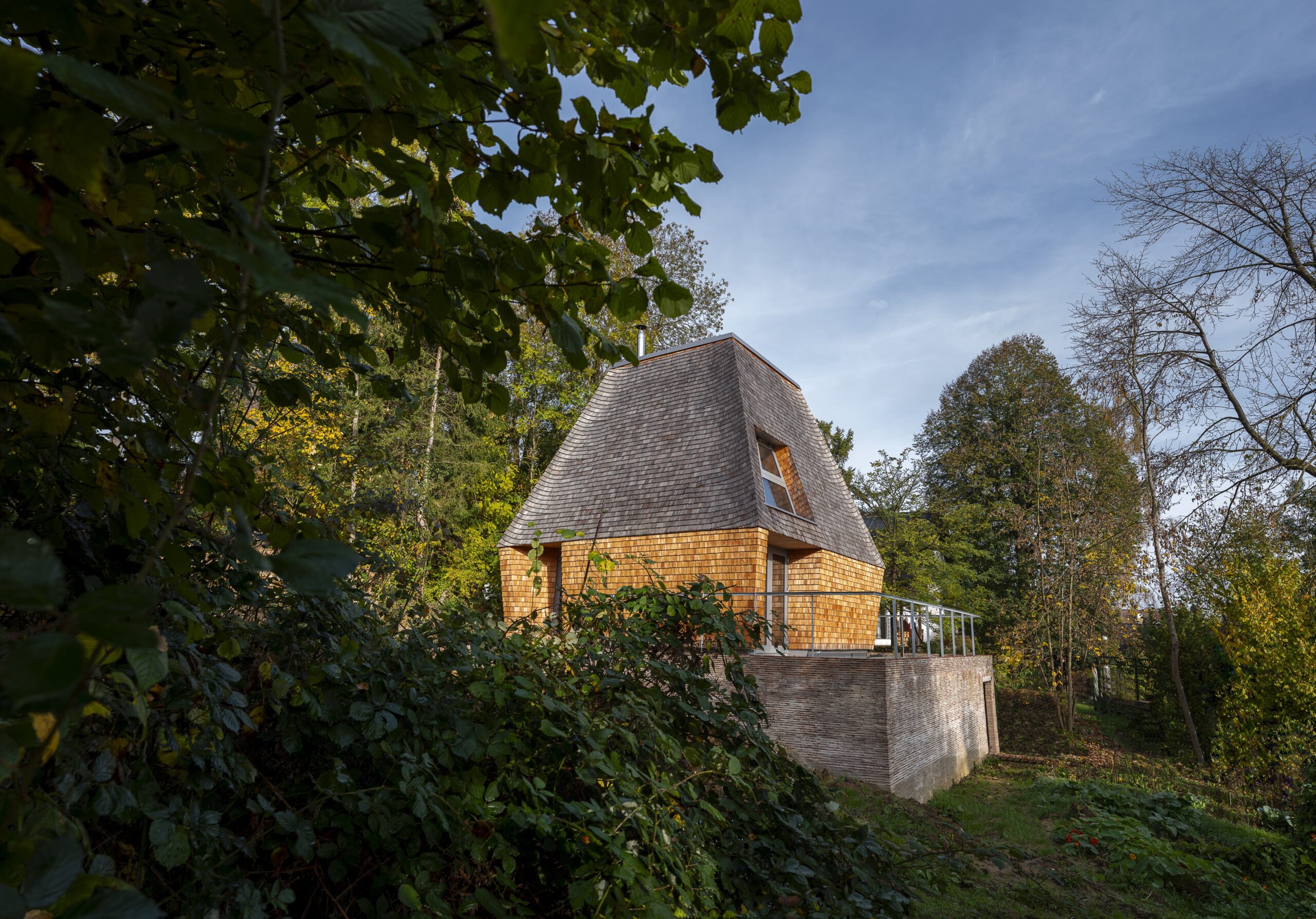 Etwas Metall findet sich dann doch im Haus. Teilweise stecken amerikanische Bombensplitter aus dem Zweiten Weltkrieg in den Holzelementen. „Wir nehmen es so, wie es ist“, zitiert Lux die Bauherren, die sich mit ihren hohen Ansprüchen an nachhaltiges Wirtschaften bewusst für das Holz und seine eingeschriebene Historie entschieden. Das Innere des Hauses mit dem weich anmutenden Eschenholz steht im Kontrast zur rauhen Außenfassade und ihren handgespaltenen Lärchenholzschindeln. Nur wenige Handwerker beherrschen heute noch die traditionelle Technik des Schindelmachens.