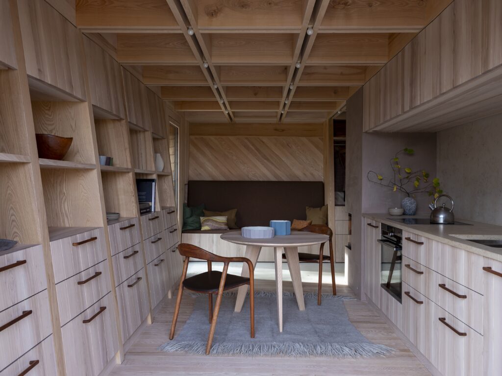 Dank der steilen Wände mit einem Neigungswinkel von 70 Grad bietet das Haus trotz seiner kleinen Grundfläche einen Stauraum von 120 Kubikmetern. Maximal genutzt wird dieser Raum durch Außenwände, die gleichzeitig als Möbel fungieren. Sofa, Regale, Schreibtisch sind in die tragende Struktur des Hauses integriert. Durch den Verzicht auf Verkleidungen bleibt das Tragwerk klar sichtbar.