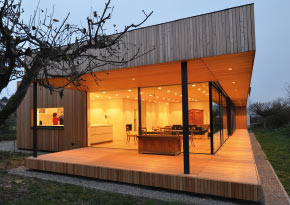 Das eingeschossige Gebäude gliedert sich in zwei Zonen, in einen Koch-, Ess- und Wohnbereich und in einen Arbeits-, Schlaf- und Sanitärbereich, die atmosphärisch sanft ineinander übergehen. Während sich Zone eins mit ihren großflächigen, raumhohen Verglasungen nach außen öffnet und die Natur ins Haus holt, gibt sich Zone 2 zugeknöpfter. Je intimer der Raum, umso eingeschränkter ist der Blickkontakt nach draußen. Und umgekehrt genauso. Milchglasscheiben lassen jedoch genügend Tageslicht einfließen. Zudem geben Dachverglasungen den Blick zum Himmel frei und sorgen schon dafür, dass auch tagsüber kein elektrisches Licht eingeschaltet werden muss.